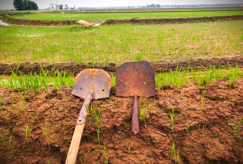 Rice shovels are unique. They have 3 holes to drain water and reduce the suction from the mud. The handle is extra-long to provide additional leverage when placed across the knee because of the heavy mud. Finally, it is essential to have a sharp shovel. I have two of my dad’s last shovels (shown in the picture). The shovel without the handle was the last of many shovels he wore out. The shovel with the handle was his very last shovel. These are Andy’s trophies. These are priceless treasures to me. The shovel will do nothing on its own…it takes someone’s work & sweat for it work.