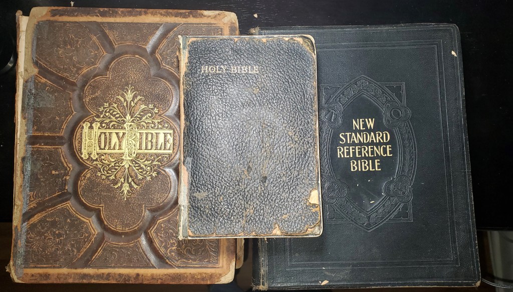 I am Blessed to have my mother’s tattered Bible (small Bible in the middle), mother & dad’s family Bible (large black Bible on right) and what I believe to be my grandparents very old family Bible (brown Bible on the left).