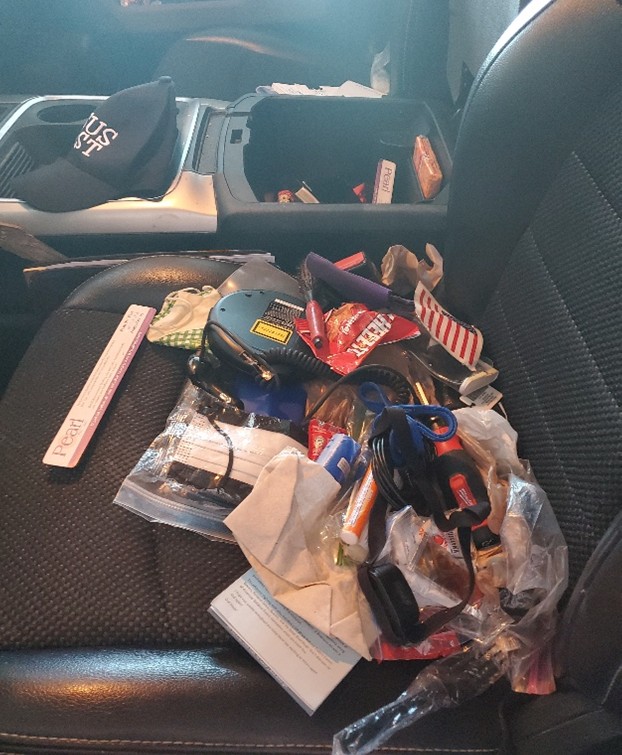 Two weeks ago, vandals took advantage of me forgetting to lock the doors of my truck. The next morning when I opened my door this is what I found. All the glove boxes and consoles had been emptied and thrown onto the seat & floor…except one. If you notice in the top left corner of the picture, there is a cap. Nothing was touched in this part of the console.