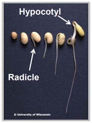 “The radical (root) is the first structure to emerge from the germinating seed, usually within 48 hours of planting under optimum conditions. The radical grows downward rapidly and can provide moisture to the germinating seed. The hypocotyl is the seedling structure that emerges from the soil surface.” University of Arkansas, Division of Agriculture, Research & Extension
