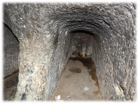 The picture is a tomb around Jerusalem. Note the picture reveals part of the tomb area. It was explained to us, “If you hold out your hand with the palm up, the wrist area would be the entrance area to the tomb. The palm area is where the body would be laid to prepare it for burial. Once the body was prepared it would be placed in one of the fingers, shown in the picture, of the tomb. There the body would lay until it was decomposed. Then the bones would be gathered with the bones of the family.’